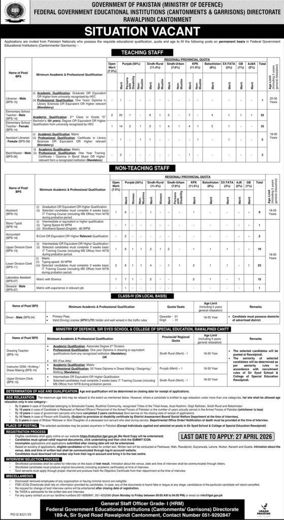 Q1: What is the last date to apply for Federal Government Education Institutions Cantt Garrison Job April 2026? The Application Deadline for all teaching and non-teaching positions is April 27, 2026.
