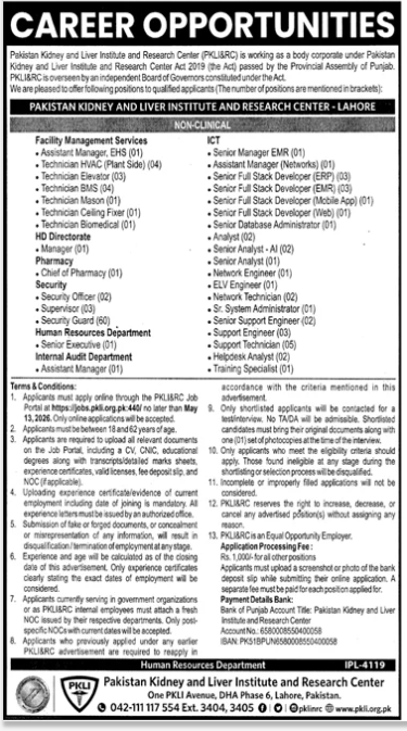 The Pakistan Kidney and Liver Institute and Research Center has officially announced its latest recruitment drive for 2026. Based in DHA Phase 6, the PKLI Lahore campus is seeking qualified professionals for various non-clinical roles to support its mission of providing specialized healthcare. These Pakistan Kidney and Liver Institute vacancies are open to candidates meeting specific technical and administrative criteria.