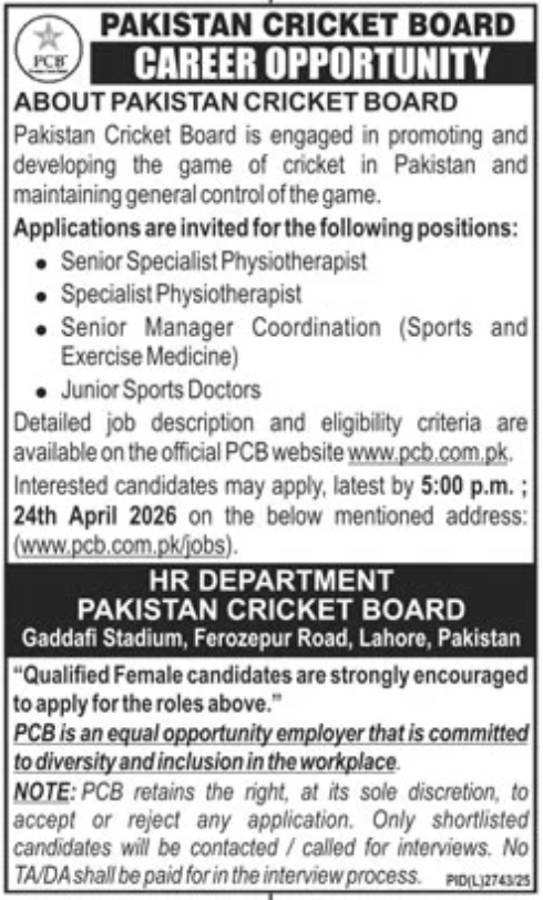 Great news for medical and sports management professionals in Pakistan looking to join the elite cricket circuit. The Pakistan Cricket Board (PCB) has just opened applications for several high-profile specialist roles based at their Lahore headquarters. If you are a qualified Physiotherapist or Sports Doctor, this is a prime opportunity to work within the national sports framework.