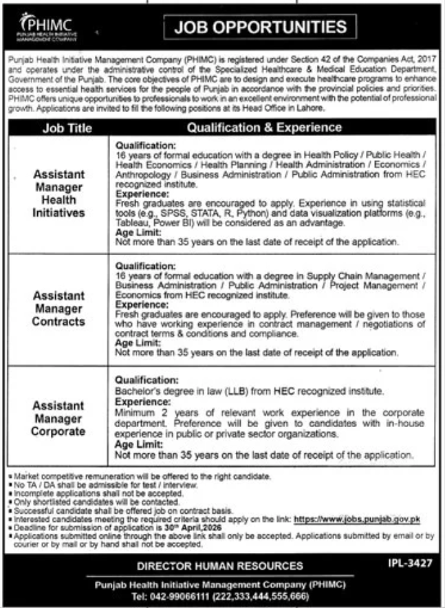 Great news for job seekers in Lahore and across Punjab – the Punjab Health Initiative Management Company (PHIMC) has opened applications for key management roles. This government-linked firm focuses on boosting healthcare access through provincial programs. If you have a relevant degree and skills in health policy or admin, these contract positions offer market-competitive pay in Lahore.