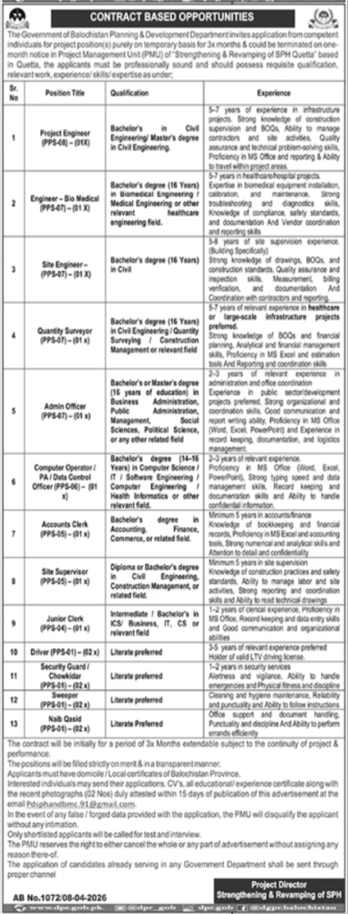 This is a fantastic opportunity for professionals ranging from expert Civil Engineers to skilled support staff to contribute to a high-impact development project in Quetta. If you have the right qualifications and a passion for public sector development, this recruitment drive is for you.